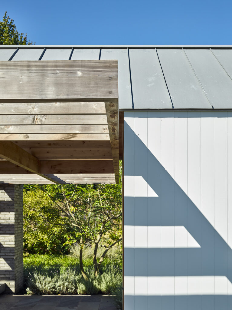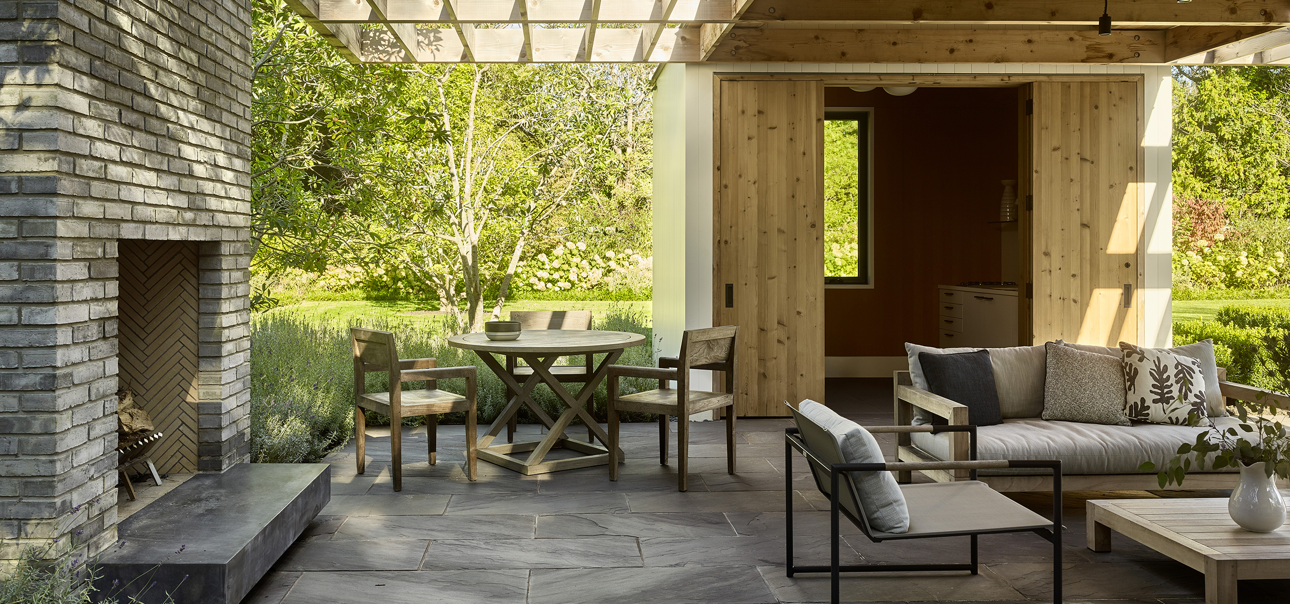 Cedar louvers, bluestone floors and a natural zinc roof, which will patina over time, add a collection of natural elements to the indoor/outdoor structure.