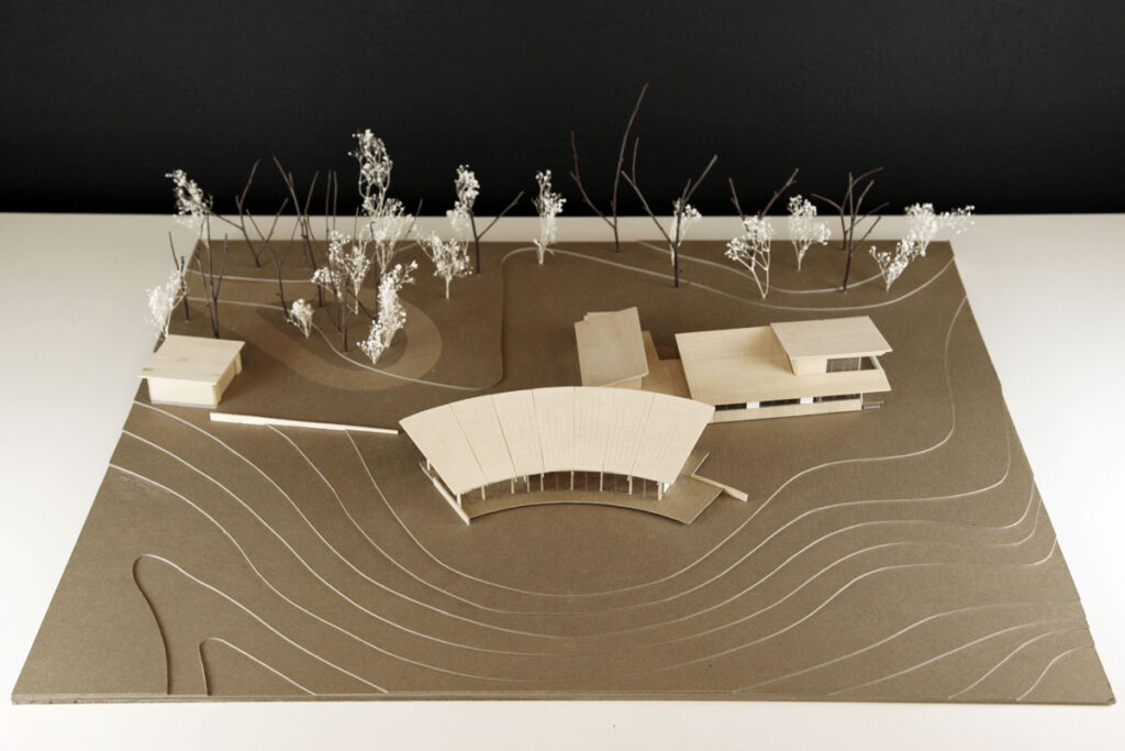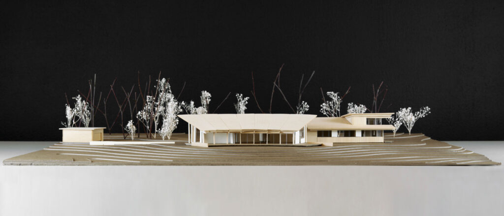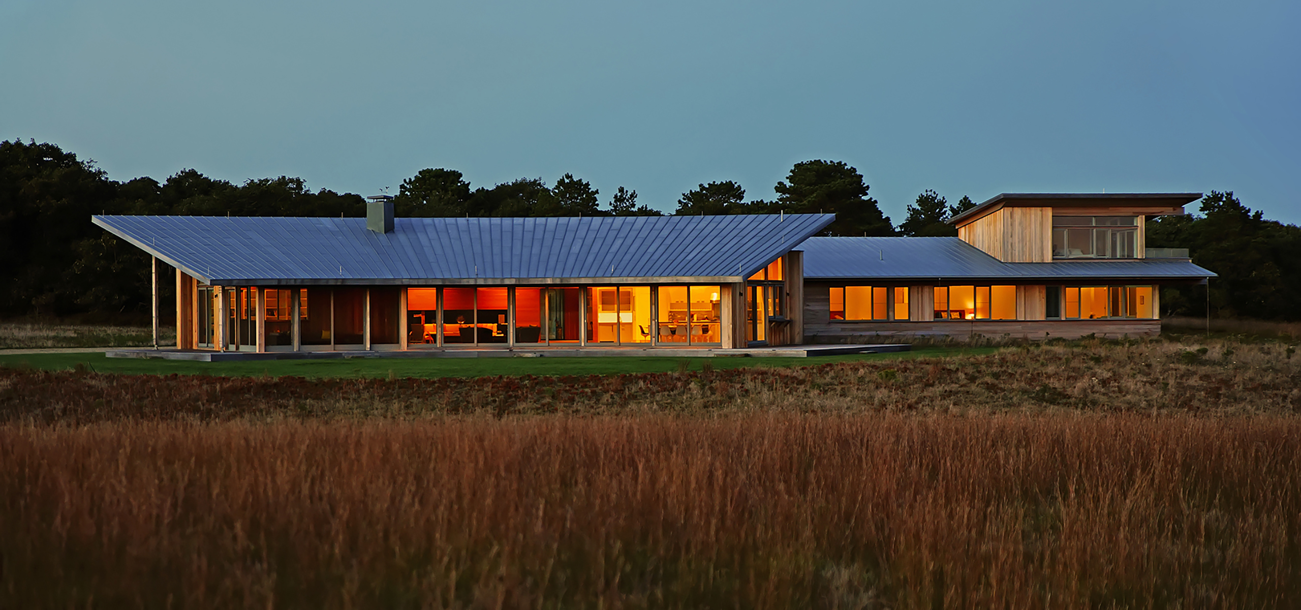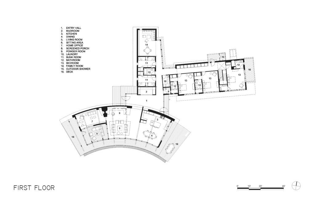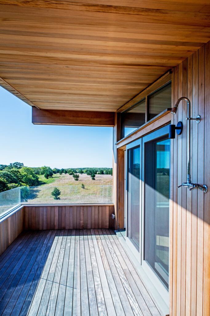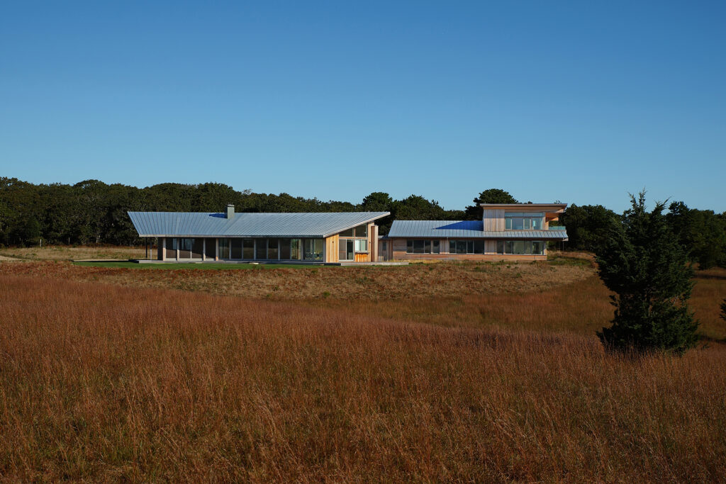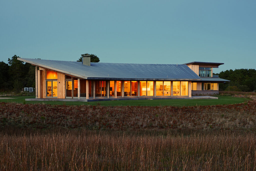 The house’s curve is calibrated to the sun’s path, maximizing shade in the summer months, while offering a variety of framed views to the expansive meadows and the Atlantic Ocean.