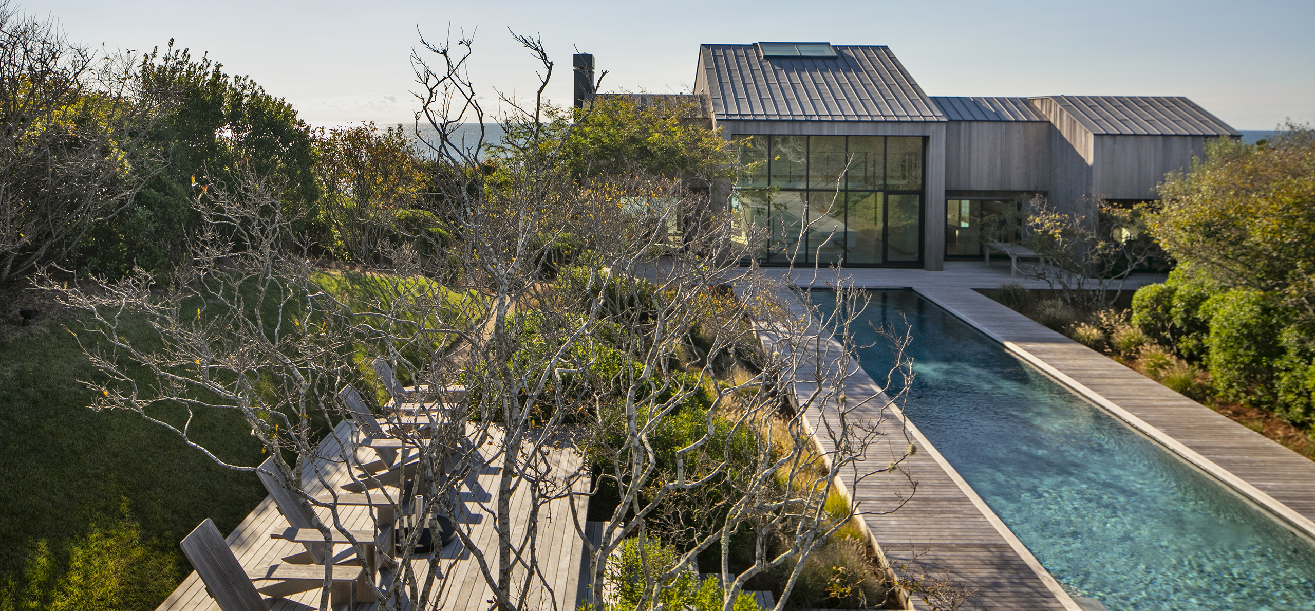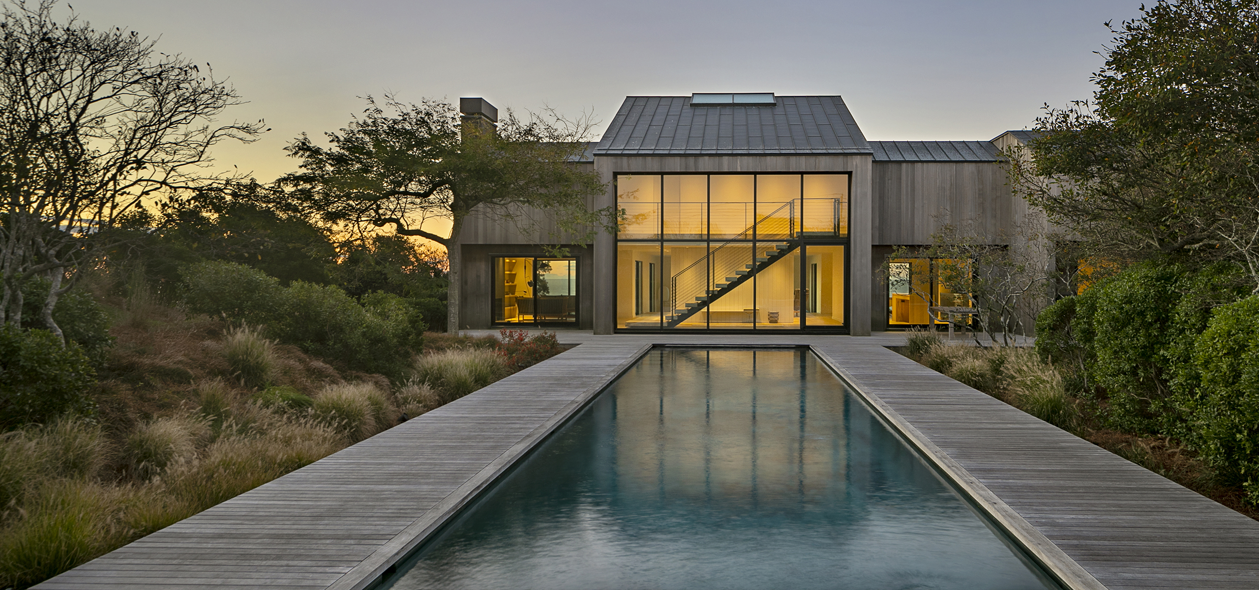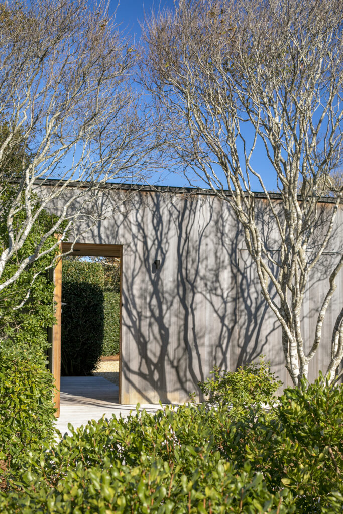 Employing a natural material palette for the exterior cladding and decking, the built environment seamlessly connects to the landscaped components of the site.